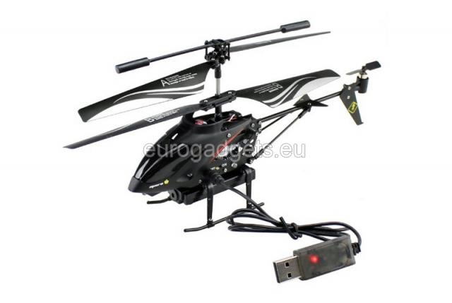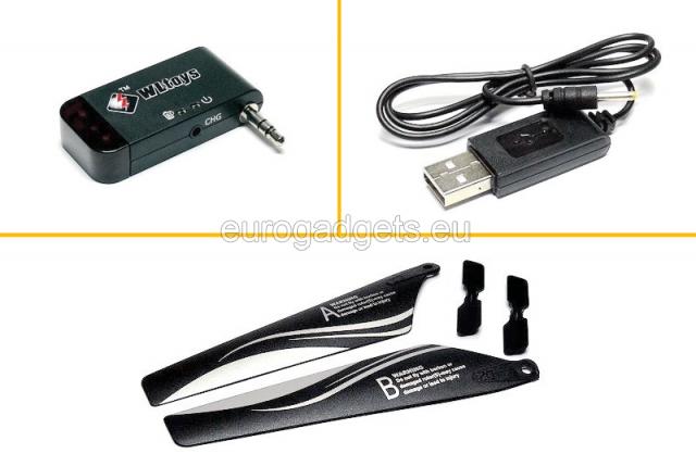 The helicopter has a rechargeable battery 3.7V, 280 mAh, which is charged for about an hour and allows for a ten minute flight.